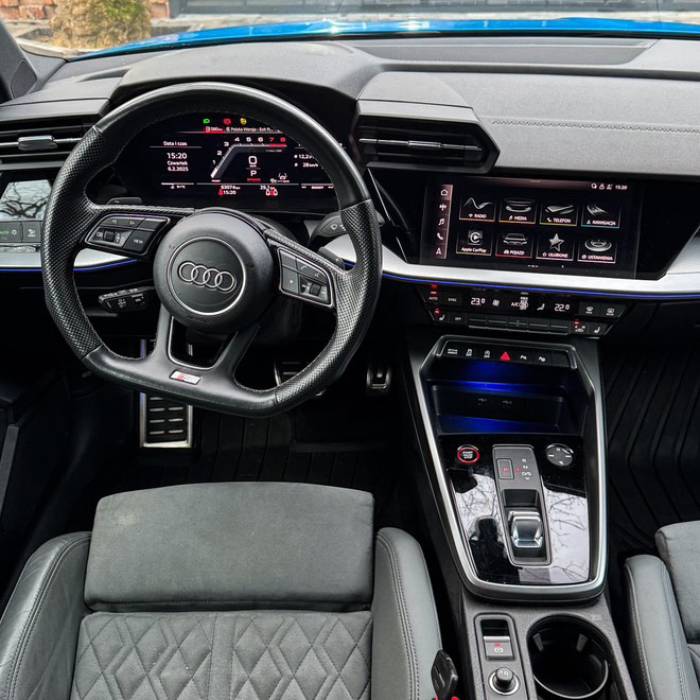 Wnętrze Audi S3 to połączenie sportowej elegancji i nowoczesnych technologii – kubełkowe fotele z kontrastowymi przeszyciami, wirtualny kokpit Audi Virtual Cockpit, dotykowy MMI Touch oraz systemy wspomagające kierowcę tworzą przestrzeń, w której liczy się każdy detal.