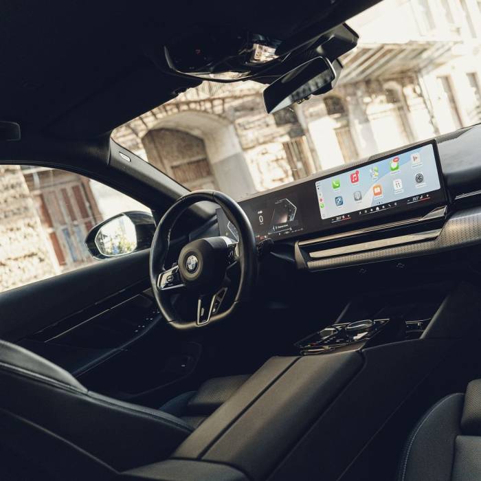 Wnętrze BMW 520d to synonim luksusu i innowacji – zakrzywiony ekran BMW Curved Display z systemem iDrive 8.5, cyfrowe zegary, ambientowe oświetlenie, wysokiej jakości materiały oraz wygodne, ergonomiczne fotele tworzą przestrzeń, w której komfort i technologia idą w parze.