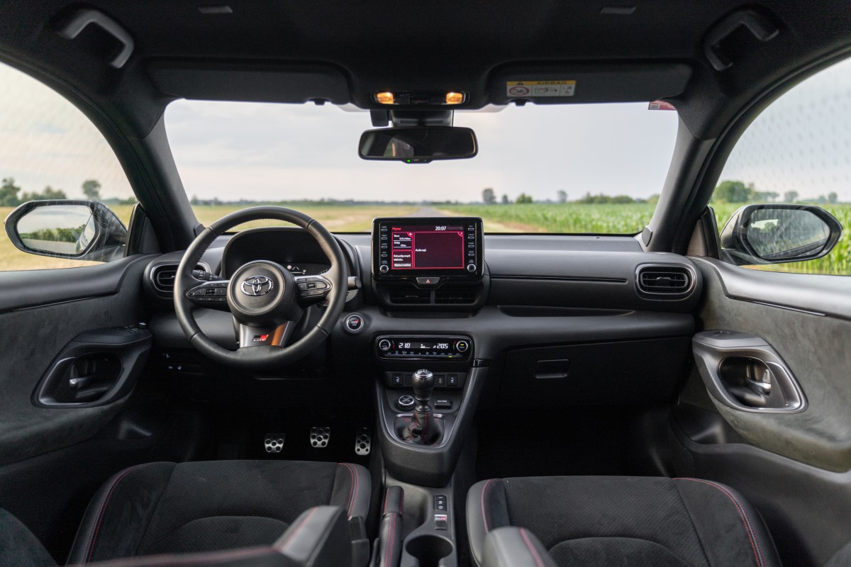 Wnętrze GR Yarisa to połączenie nowoczesnych technologii i sportowego charakteru – kubełkowe fotele, cyfrowe zegary i tryby jazdy inspirowane rajdowymi warunkami pozwalają dostosować auto do własnych preferencji.
